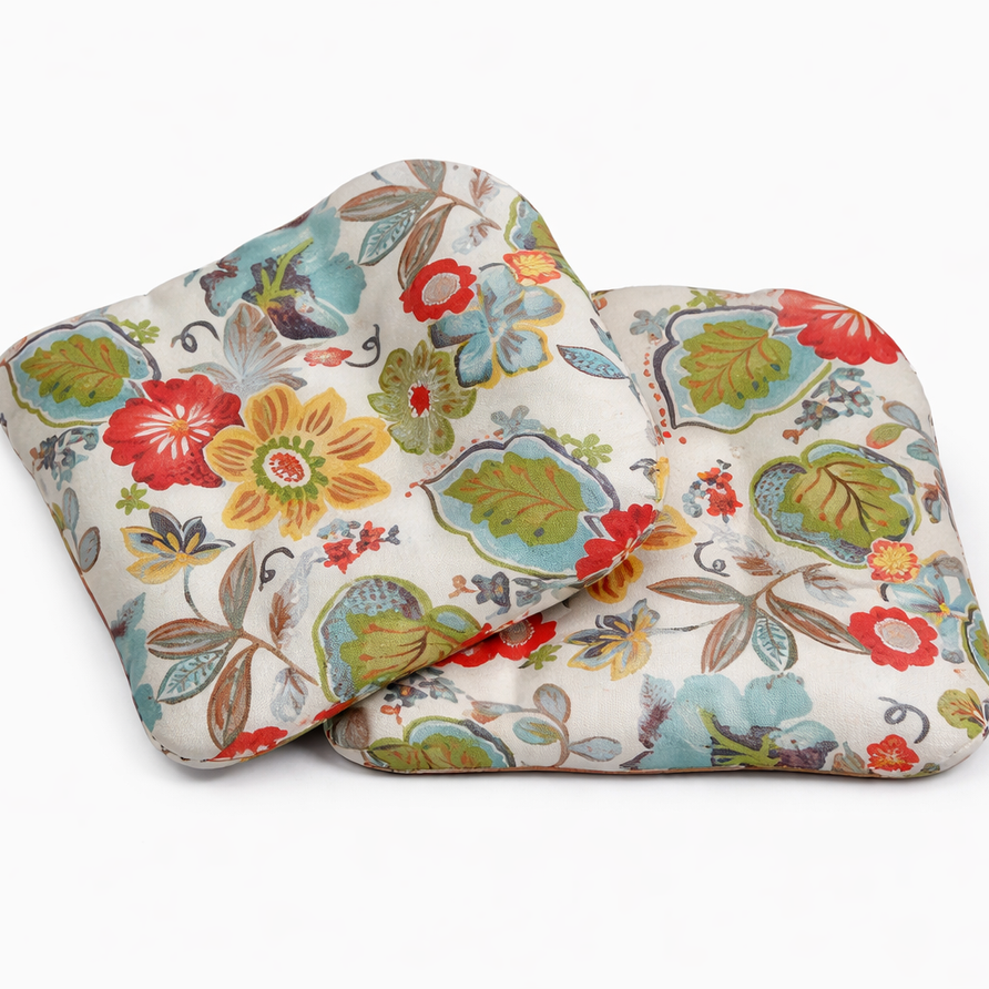 Pair of vibrant floral cushions designed for seating